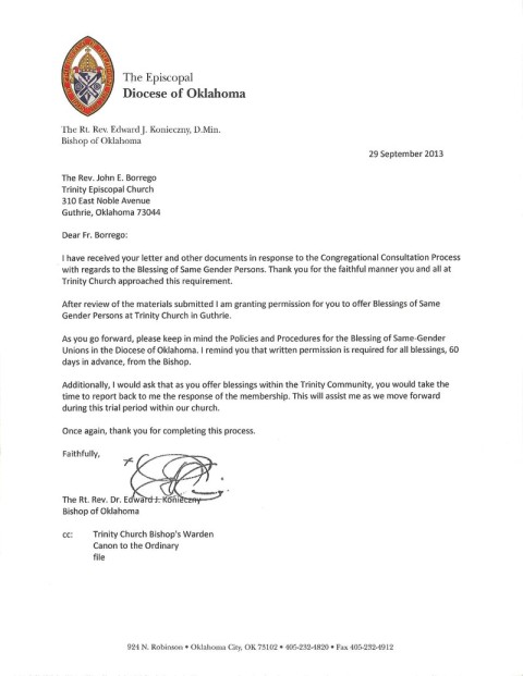 Under the policies of the Episcopal Diocese of Oklahoma, Trinity Church has received permission from the Rt. Rev. Edward J. Konieczny, Bishop of Oklahoma, to offer the blessing of same-gender unions to members of our church community. The Diocese's policies (see them here) require that any couple seeking this blessing be prepared to enter a life-long union, receive extensive counseling, and understand that such a union is not a legal marriage in the state of Oklahoma. At least one of the couple must be a member of the Episcopal Church. The "banner statement" of Trinity Church is: "Seeing God in All People." We are grateful to Bishop Konieczny for helping us make this a further reality in our church family.